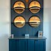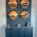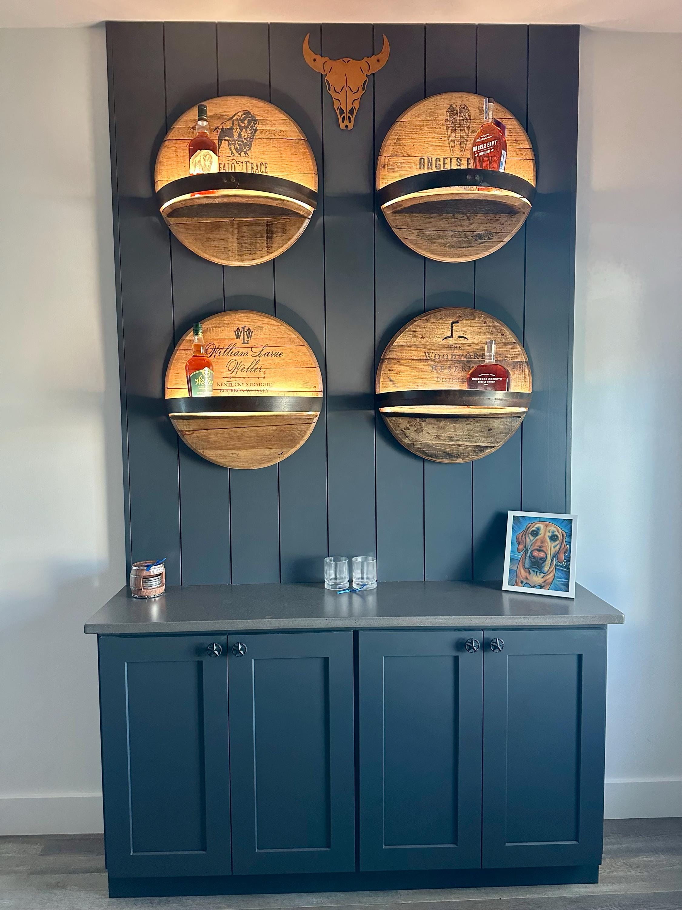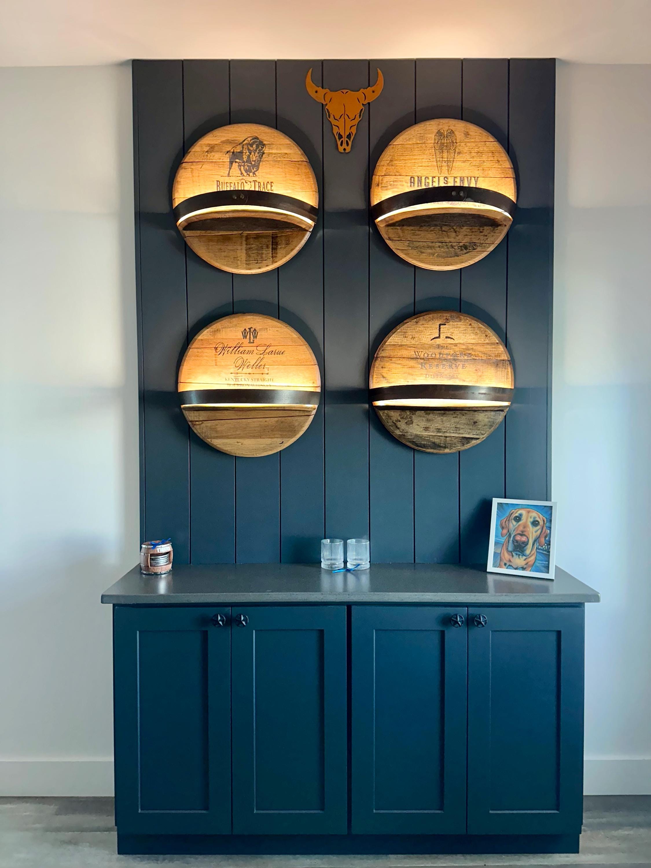 This is a real Bourbon Barrel Top. You can get your choice engraved logo, options below. If you don't see the brand, you want message me and I can get it for you. This shelf is made from a refurbished bourbon barrel head. We clean them up and sand them just enough to get the grime and rough edges off, while maintaining their rustic charm. We then seal them with multiple coats of semi-gloss lacquer. The shelf part itself is made from a piece of a second bourbon barrel top, cut down to size. We then place a metal ring, also from a bourbon barrel, around the front. The bands may be bent or dented, we try to straighten them out as much as possible, without losing their rounded curve. Some tops may have a bung in the center, while others might not, depends on stock available at time of purchase. If you prefer one either with or without a bung, leave a note at checkout. These beautiful shelves are easy to hang and pre-mounted with a French cleat. All you have to do is hang the other half of the French cleat on the wall and slip your new shelf into place. The wide 6-inch French cleat will keep your shelf level and secure. I also include drywall anchors, so you are ready to hang your shelf as soon as it arrives. The top itself measures approximately 21-22 inches in diameter. The shelf piece measures approximately 7 inches wide, and it is up around 6 inches from the bottom of the top.