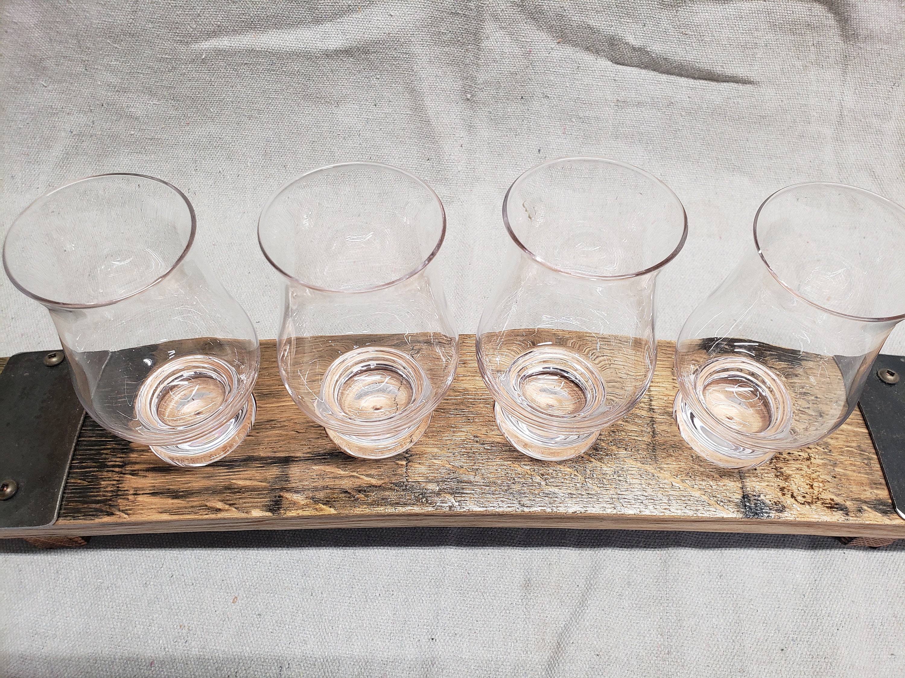 Four 8 oz. tasting glasses nest in a beautiful wooden tray. The sleek design keeps your single malt scotch or brandy safely in place, while the platform beneath the stave makes it easy to pick up and set down. Measuring 20” long by 3.5” wide by 2-1/2” tall, makes this the perfect tray for any size home and a perfect and stylish way to serve your friends and family. Being both stylish and functional, these trays serve as a multifaceted decorative accent to any home décor. Whether you’re entertaining guests or simply adding a decorative touch to your space, this serving tray will be an essential addition to your farmhouse chic.